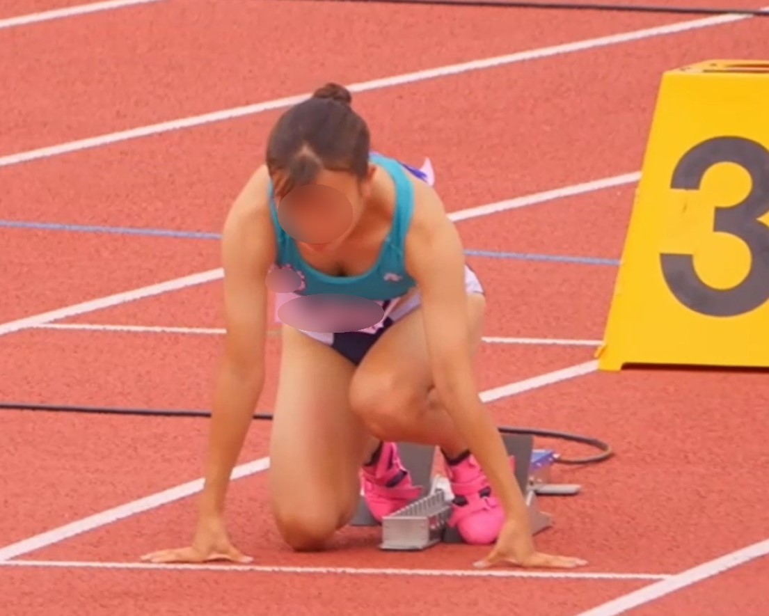 ブラトップの胸の谷間に視線が釘付けクラウチングスタート